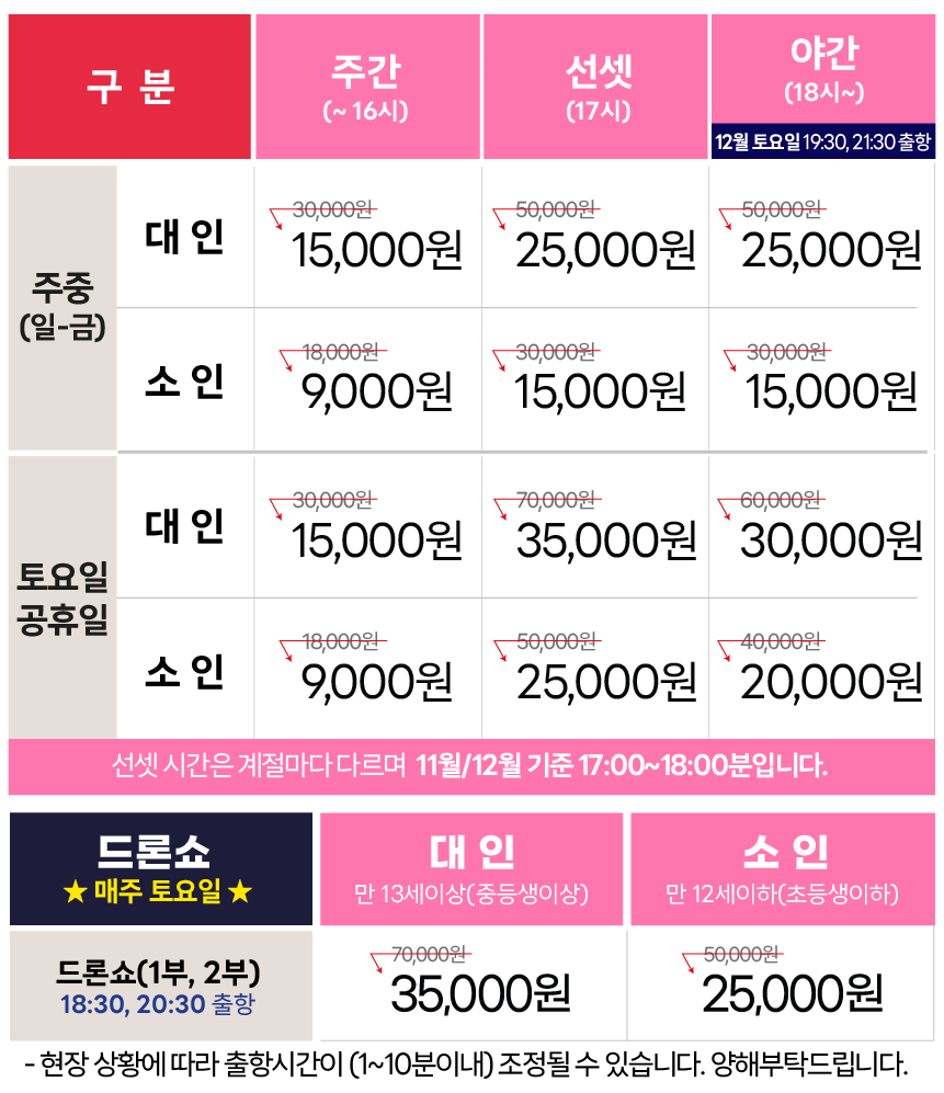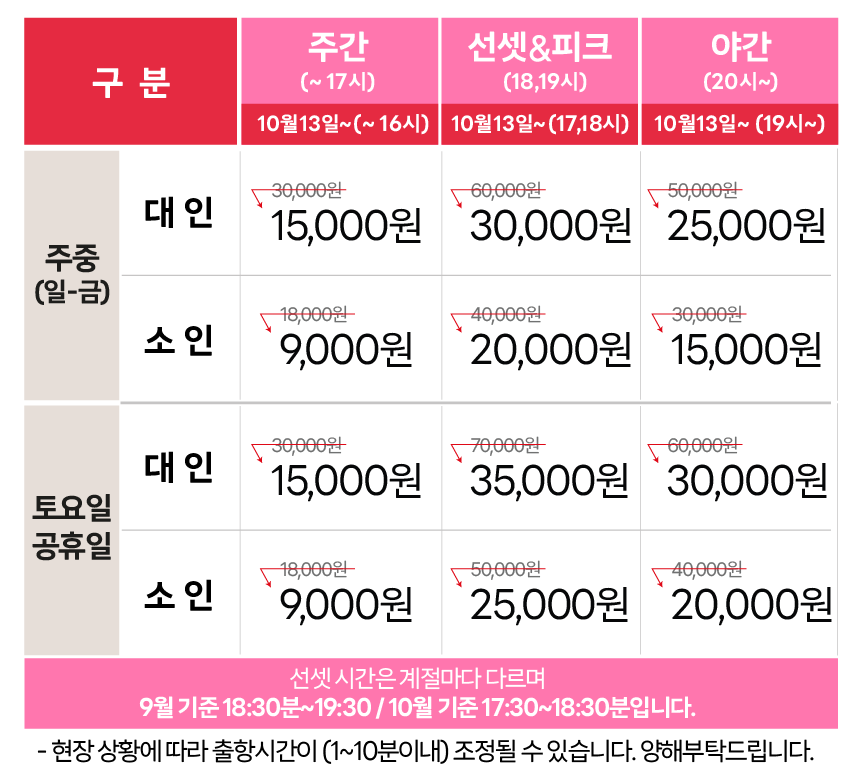 ※ 운항체험은 운항사에게 요청 시 가능합니다.※ 기상 상황(일몰시간,우천,풍랑) 및 업체사정에 따라